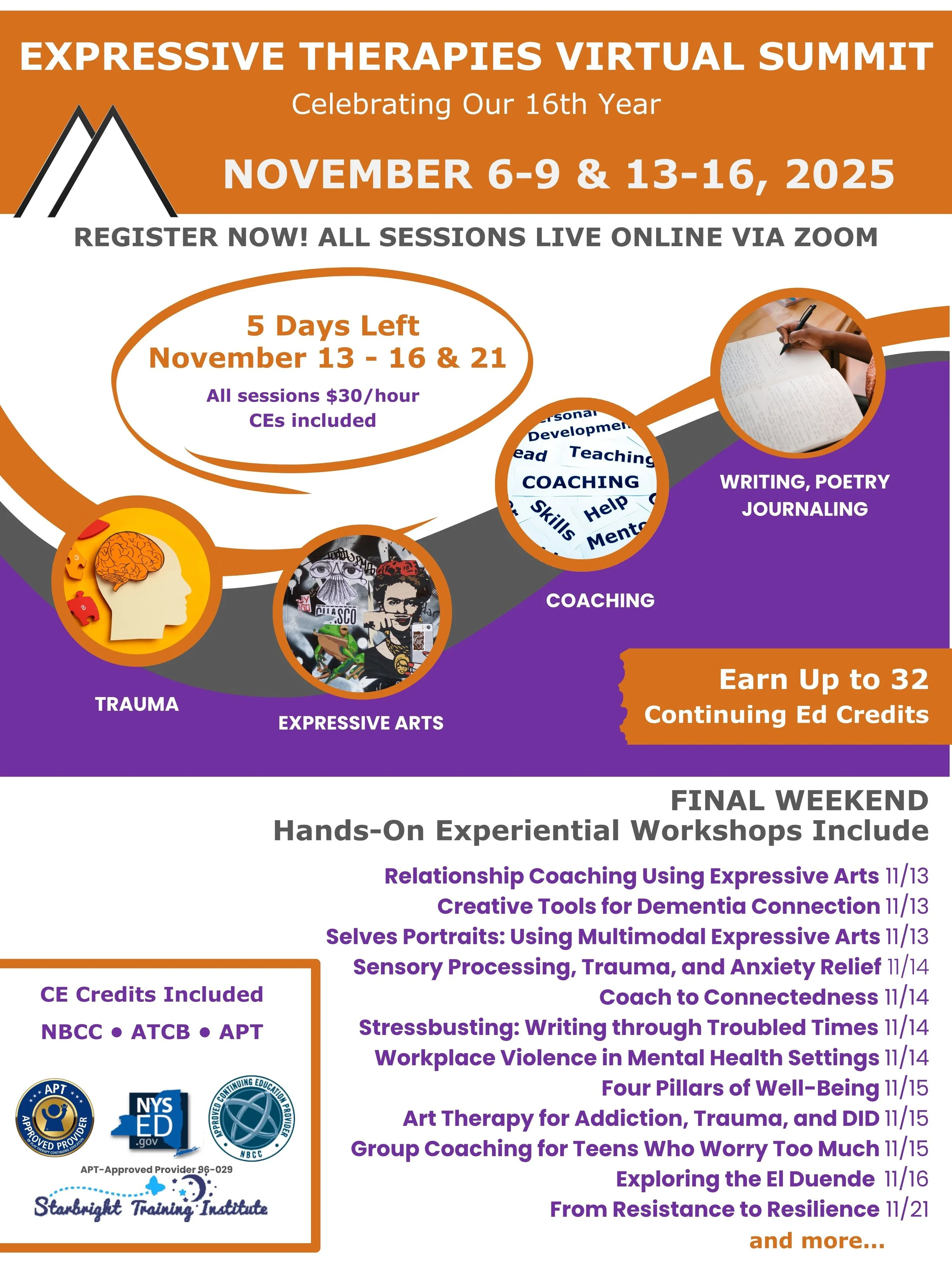 Experience the transformative power of creative and expressive therapies at the 16th Annual Fall Virtual Summit. This two-week event provides ample opportunities to expand your skills and deepen your practice. Engage in hands-on, experiential sessions led by leading experts in art, music, drama, dance, poetry, and play therapy. Whether you’re looking to explore new therapeutic techniques, strengthen your clinical toolbox, or gain fresh insights into working with diverse populations, this summit offers an enriching and practical learning experience. Discover innovative approaches that support healing, resilience, and personal growth, all from the comfort of your own space. Join a vibrant community of professionals committed to harnessing the arts for meaningful change in the lives of their clients.
